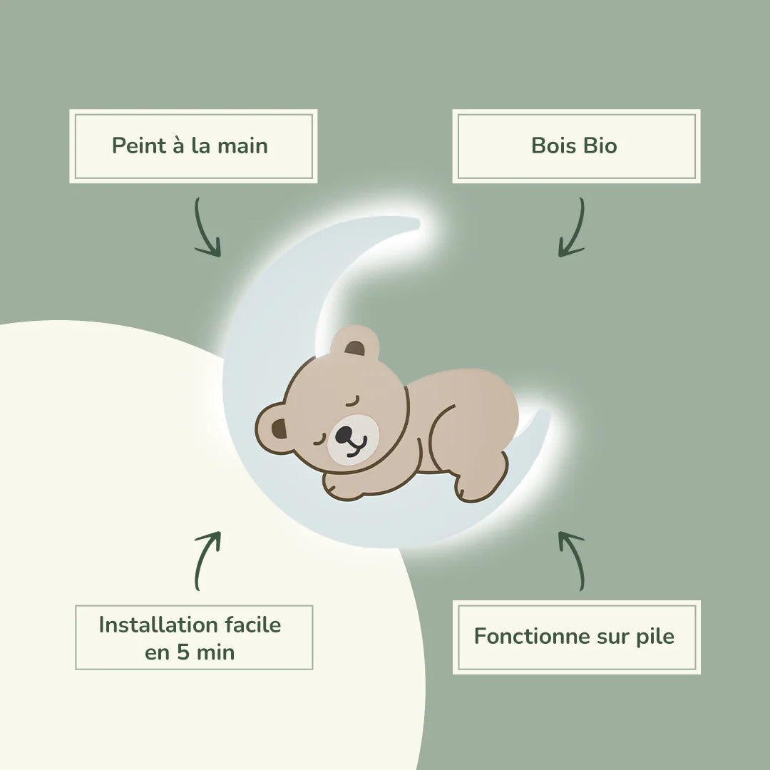 Concebida en madera natural certificada y equipada con un sistema LED de bajo consumo, difunde una luz suave que tranquiliza sin perturbar el sueño. Su fácil instalación y su estilo atemporal se adaptan a todos los universos, añadiendo un toque de poesía y elegancia a la decoración.