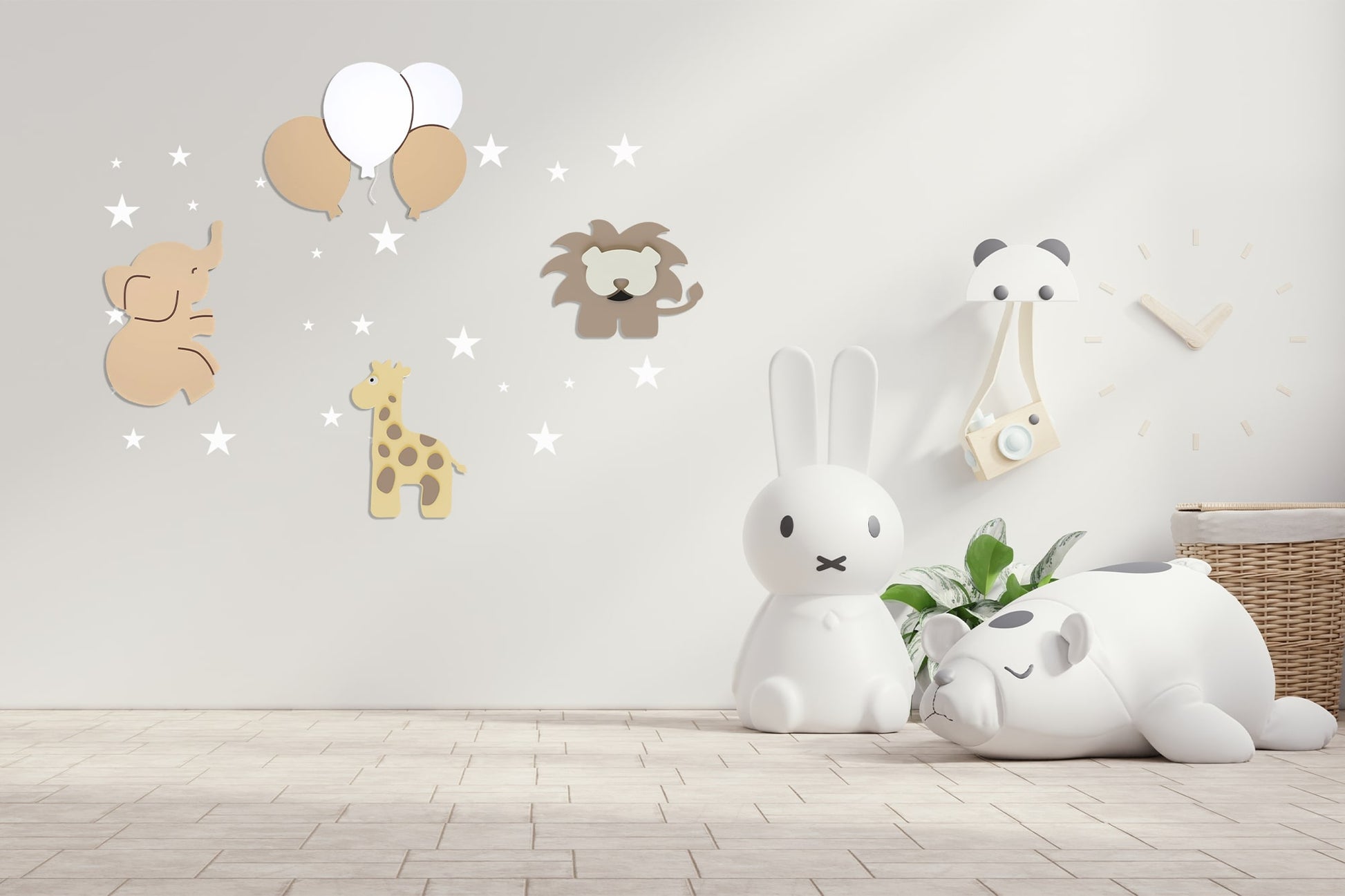 Contenu du coffret : Babynotte : Éléphant, Lion, Girafe, 4 Ballons . Stickers : Pack 55 étoiles